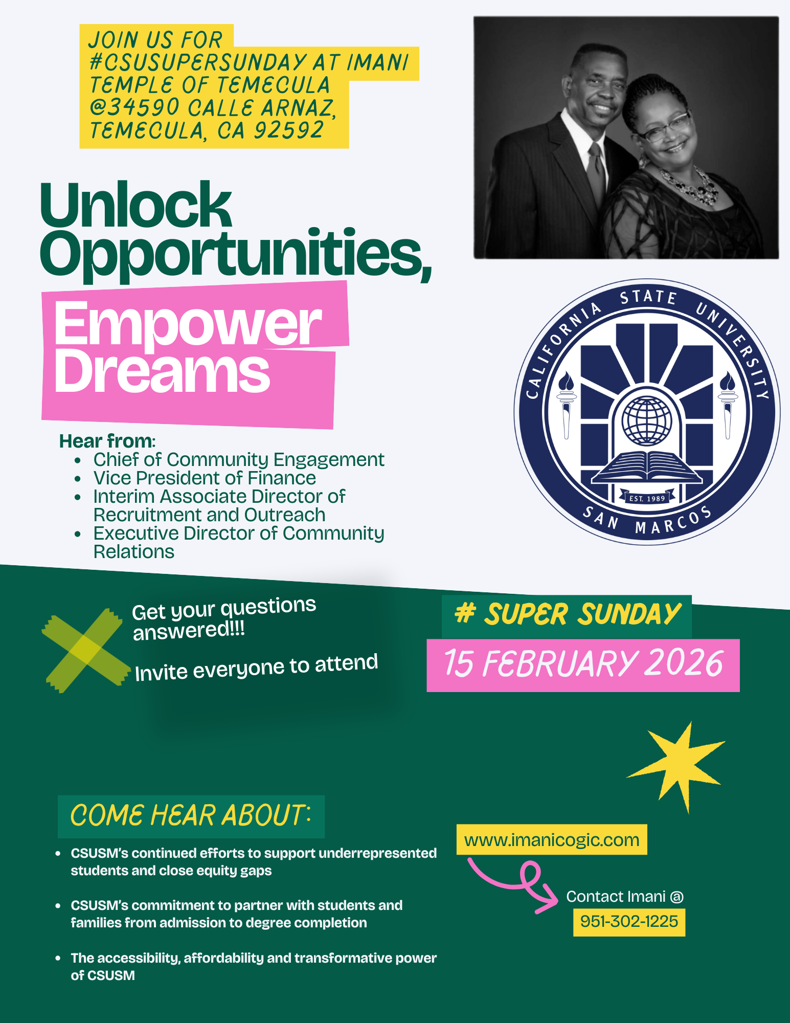 CSUSM Super Sunday @ Imani Temple COGIC Sunday, February 15, 2026 9:00 AM 11:00 AM Imani Temple of Temecula Christian Community Center, COGIC 34590 Calle Arnaz Temecula, CA, 92592 United States (map) Google Calendar ICS Join us for a special community engagement event featuring leadership from California State University San Marcos. This event is designed to inform, inspire, and empower students, families, and the community.