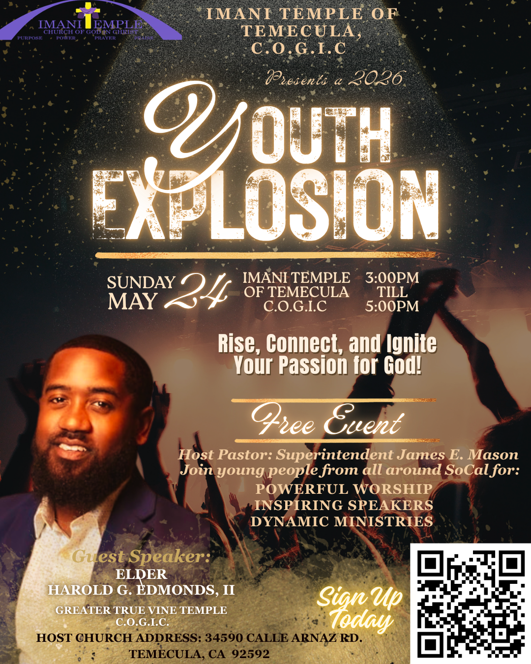 Youth Explosion Sunday, May 24, 2026 3:00 PM 5:00 PM Imani Temple of Temecula Christian Community Center, COGIC 34590 Calle Arnaz Temecula, CA, 92592 United States (map) Google Calendar ICS